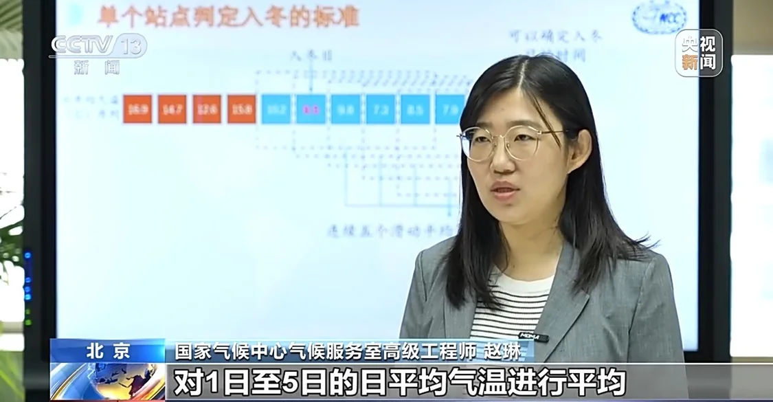 国家气候中心气候服务室高级工程师 赵琳:什么是5天滑动平均气温?举个例子,对1日至5日的日平均气温进行平均,得到一个平均值,以此类推,2日至6日,3日至7日,4日至8日,5日至9日,即得到5个平均气温,这5个平均气温就被称为5天滑动平均气温。在计算5天滑动平均气温用到的9天的单日平均气温中,当首个日平均气温小于10℃的时候,这一天就是判定的冬季起始日。